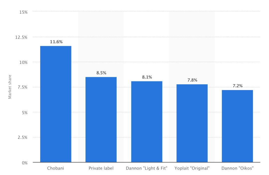 Chobani很快跃居美国最畅销的酸奶品牌,在整个非冷冻酸奶行业中占有10%的市场份额,并且Chobani在希腊酸奶品牌中占据了主导地位,占据了大约50%的市场份额。