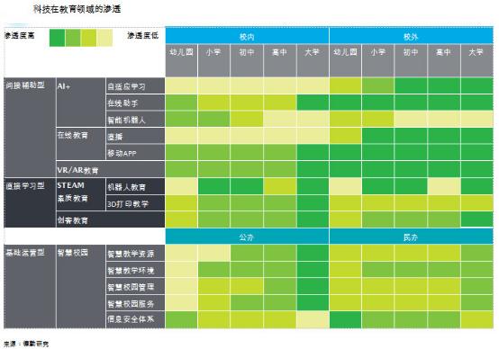 根据德勤《2018年中国教育发展报告》,当前科技在教育领域的应用可分为“间接辅助型”“直接学习型”和“基础运营型”三类,其中“基础运营型”是针对学校、教师而言的,如智慧校园等。