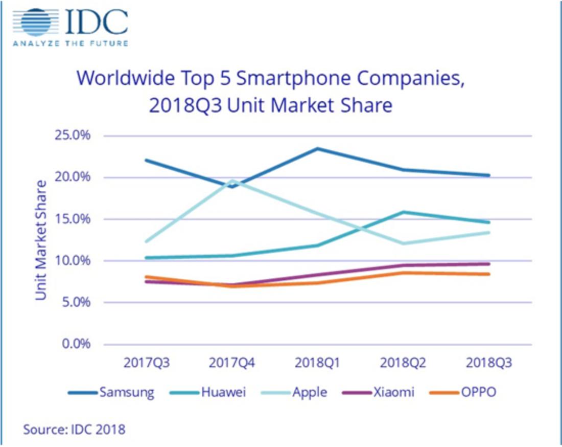同时,智能手机销量下滑也是全行业的问题。根据国际数据公司(IDC)的数据,全球智能手机供应商在2018年Q3共出货3.552亿部,同比下降6.0%。这是全球智能手机市场连续第四个季度出现同比下降,目前还没有展现复苏的迹象。