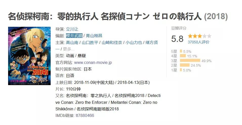 口碑上,《零的执行人》却执行的不太“顺畅”。豆瓣评分跌至5.8分,80%用户评分为三星及以下。距离《名侦探柯南》系列剧场版的最低分5.7分(《名侦探柯南:业火的向日葵》),只有仅仅0.1分之差。这一评分甚至低于争议极大的小栗旬版《名侦探柯南》真人版。