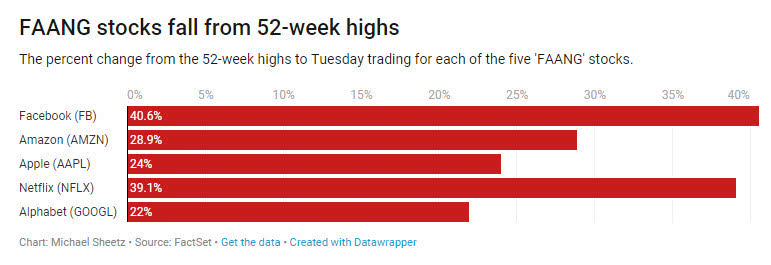 FAANG指的是Facebook、亚马逊(Amazon)、苹果(Apple)、Netflix和谷歌的母公司Alphabet。本周二五只股票均低开,其中苹果收盘重挫4.8%。其他四只股票后来走高,Facebook和Alphabet以阳线报收。