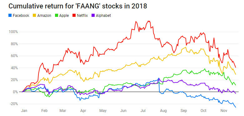 亚马逊10月25日发布的第四季度展望远低于预期,之后股价持续下跌。而Netflix和Alphabet的股价基本上与FAANG的其他股票在同步下跌。