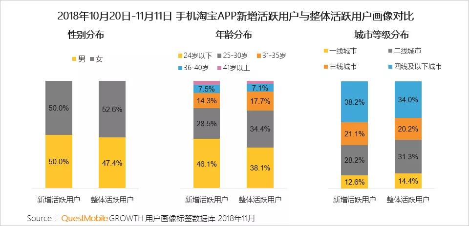 “双11”期间,新增男性剁手用户正在追平女性用户。手淘在“双11”预热期间新增用户近半数在24岁以下,60%的新增活跃用户来自于三四线。