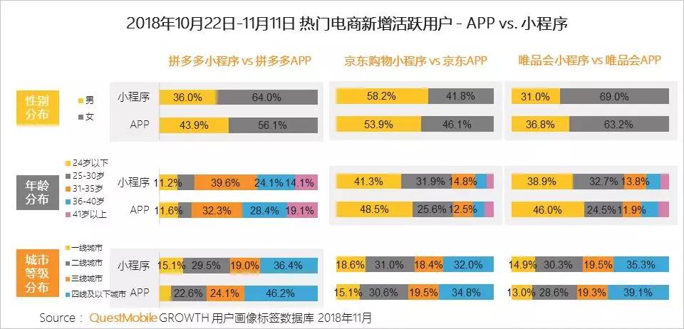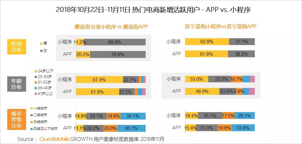 3、同一购物平台的APP与小程序在用户拉新时各有其“战场”,“双11“期间,各平台小程序与APP的新增用户存在明显的画像属性差异