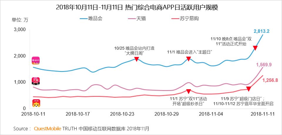3、各电商平台纷纷推出了与往年不同的新玩法,手淘、唯品会、天猫及苏宁易购都在“双11”当天引来一波爆发式DAU增长
