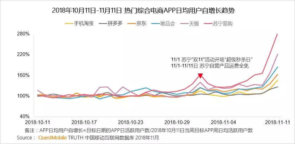 4、“双11”期间,苏宁易购日均用户自增长趋势明显上升,在其11月1日的活动开场日就出现了第一个峰值。另外,今年“双11”期间,苏宁的自营产品实现了运费全免,不必再为免运费而凑单的营销方式也吸引了不少新用户