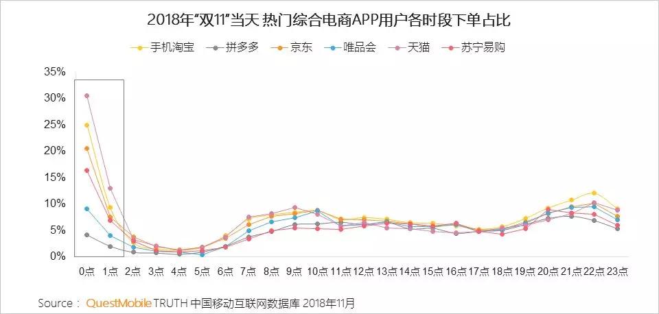 大量天猫、手淘、京东和苏宁易购平台用户选择在“双11”到来前已经挑选好商品准备在第一时间下单;此外,根据“双11”各平台普遍的抢购规则,0点开始是优惠力度最大的;加上手机淘宝、天猫平台推出的商品预售规则,用户只有在“双11”当天凌晨1点后才能付尾款,促使大量用户在0-1点时下单。