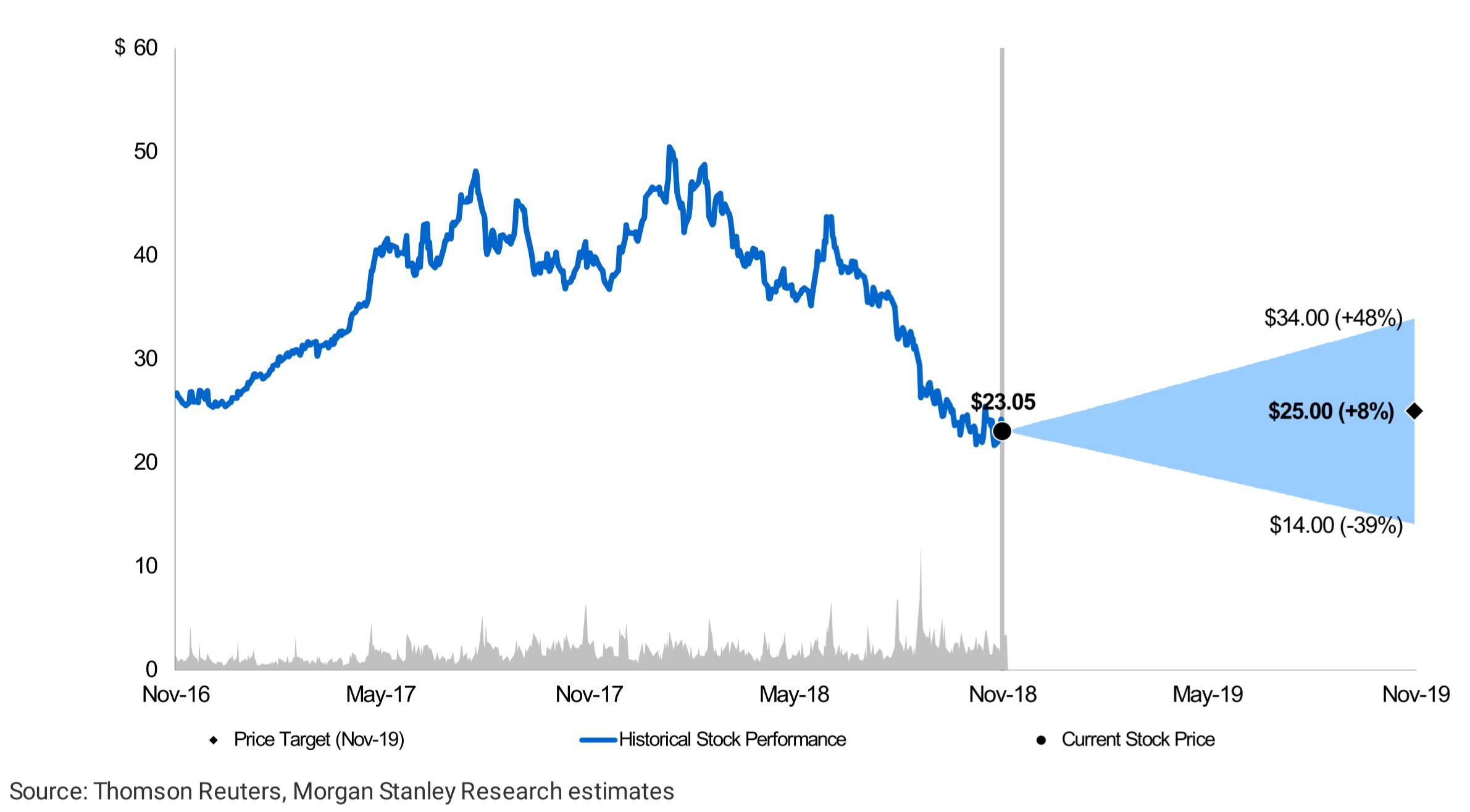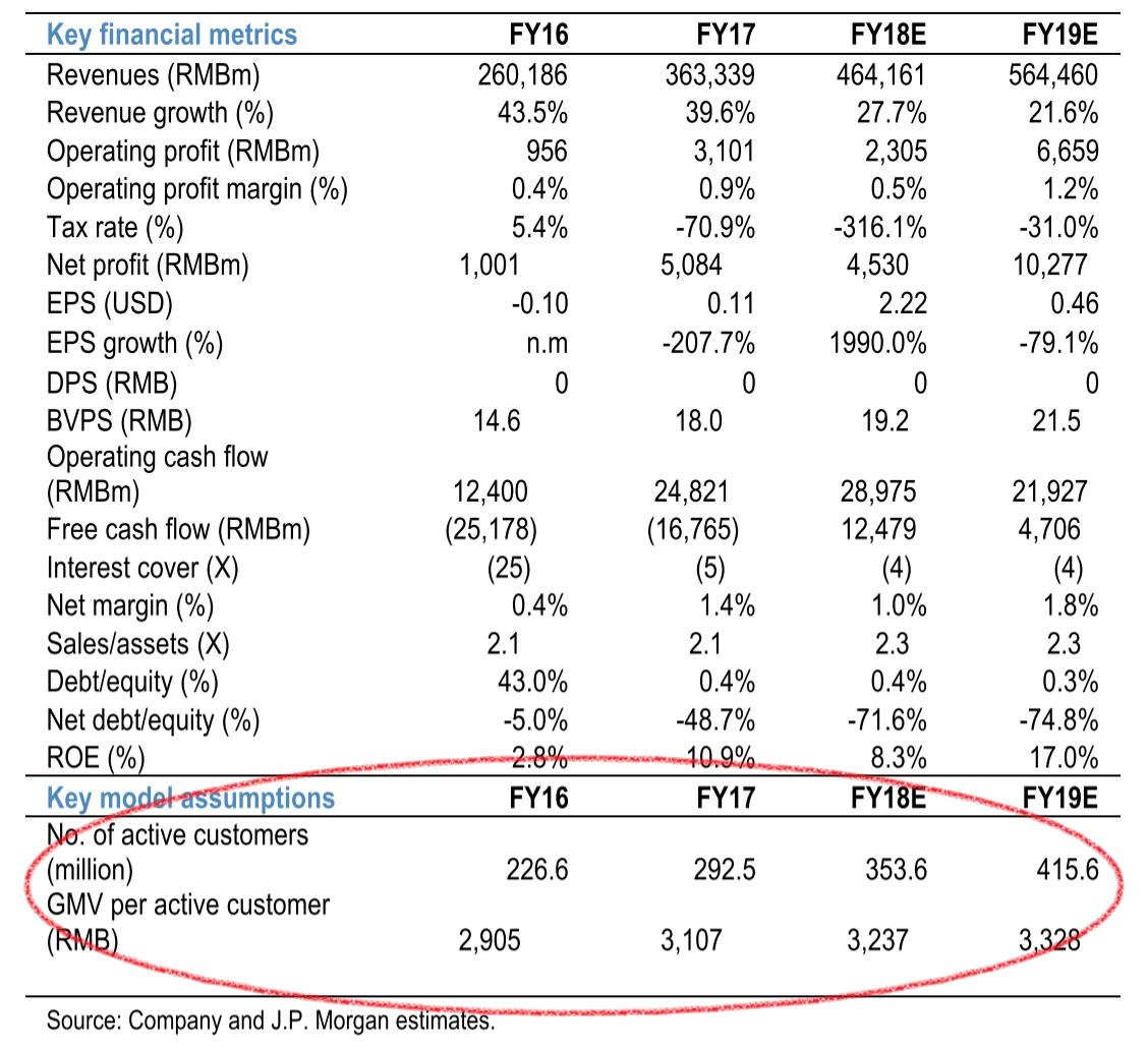 在Morgan Stanley最新的估值模型中,给出了0.5倍P/S(2019e),京东股价的上行区间顶点为48%(34美元),下行区间底点为-39%(14美元),Morgan Stanley核心关注的运营指标为Active customer numbers(活跃用户数)、ARPU(每用户平均收入)、Gross margin(毛利率)。