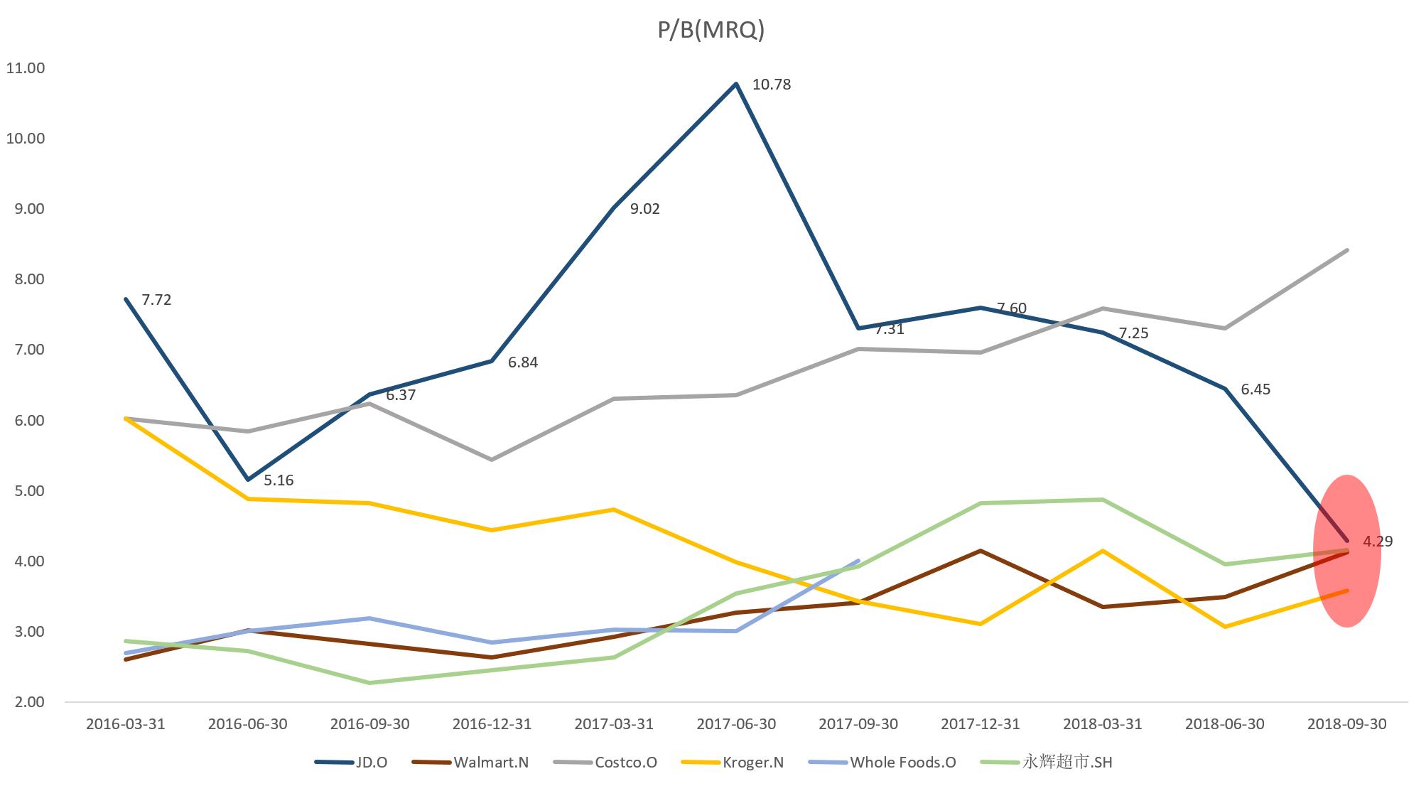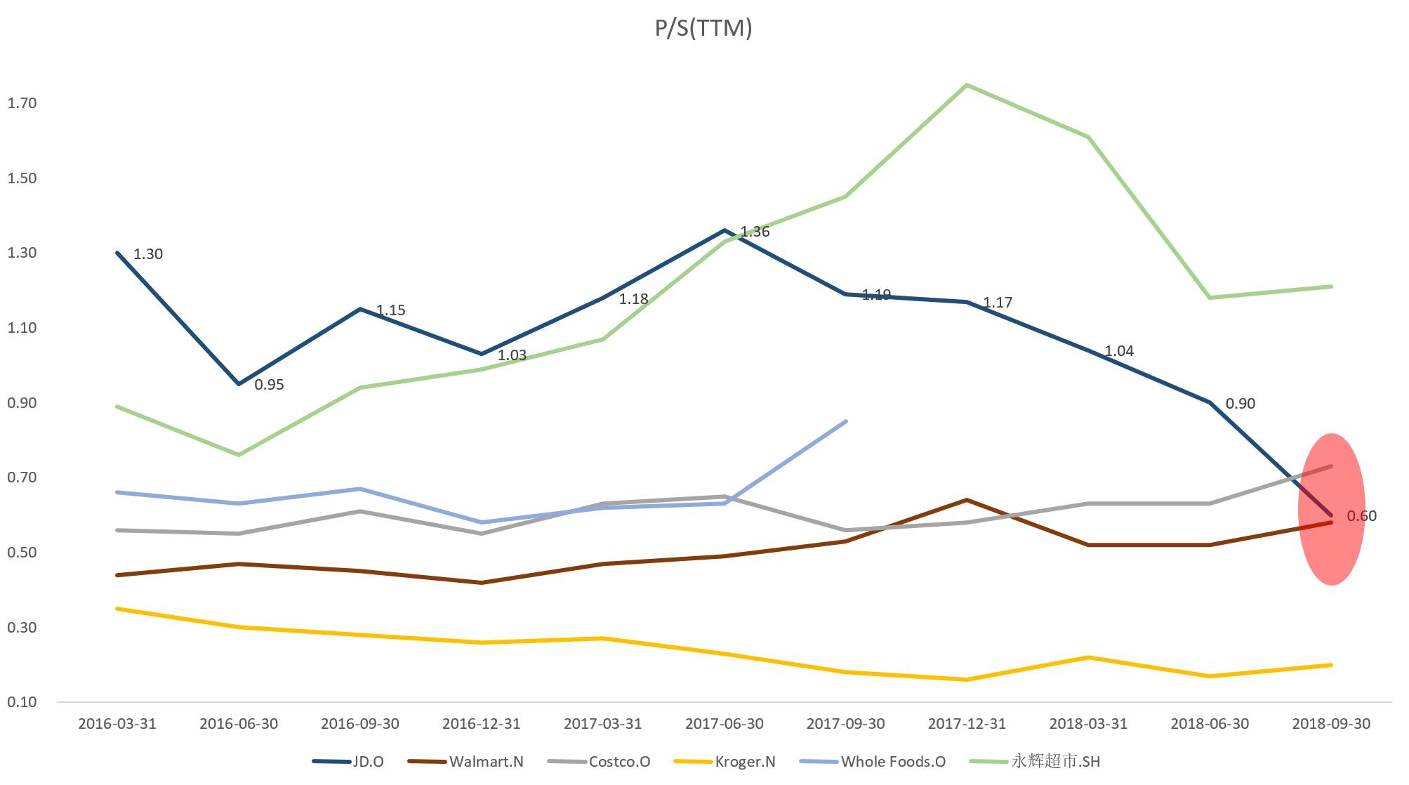 如果计算京东与沃尔玛最新的P/S(营收数据依据最近12个月:2018年三个季度及2017Q4),得出京东为0.42、沃尔玛为0.54,京东已低于沃尔玛的估值水平。