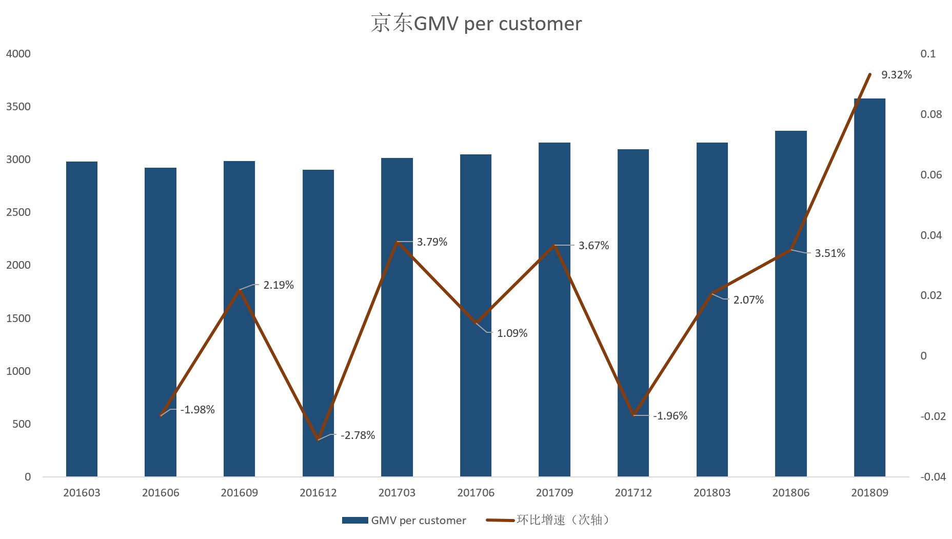 不过年度活跃用户数的计算方式是,在一年期间内,发生过一次及以上购物行为的用户就被算入,可见这一指标相对宽泛。在淘宝内容化和拼多多社交电商的优势之下,新用户“尝鲜式”购买是较容易实现的,新增用户成本低。京东所丢失的用户更多是交易贡献低的用户,因为京东平均每活跃用户GMV的增速绝对值高于年活跃用户数的跌幅。