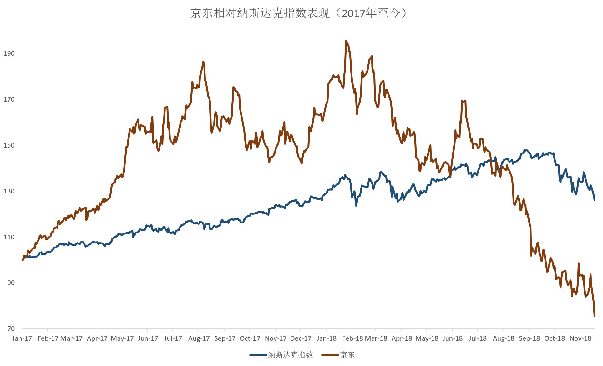 经历了昨晚(北京时间2018年11月20日)纳斯达克指数的暴跌,京东盘中一度下跌8%至19.35美元,这个数字是京东2014年IPO以来的最低点,离19美元发行价仅一步之遥,最终京东收盘于19.49美元,在中概股中跌幅居前。