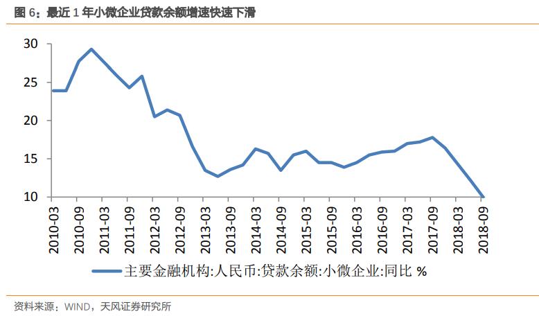 横向对比,今年 4 月-9 月,占比下降最多的恰恰就是我们上面说最应该关注的中小企业: 50-150 人的小企业占比下降 1%,150-500 人的中小企业占比下降 1.8%,其他规模企业占 比不变或上升,50 人以下的微型企业占比上升 1.5%,10000 人以上的超大型企业占比上升 1%。可见50-500 人的中小企业的经营问题和可能带来的就业问题,比大型企业和微型企业更加严峻。根据央行的数据,今年 3 季度,全国小微企业贷款余额增速下降至10%(前值为 12.2%,去年同期为 17.8%),为 2009 年数据公布以来最低。