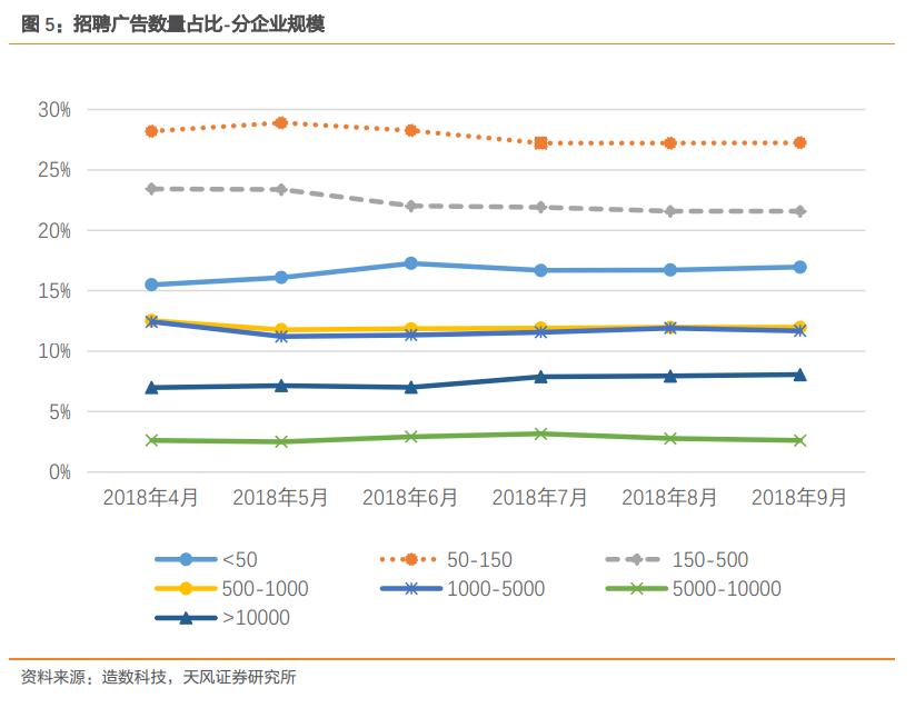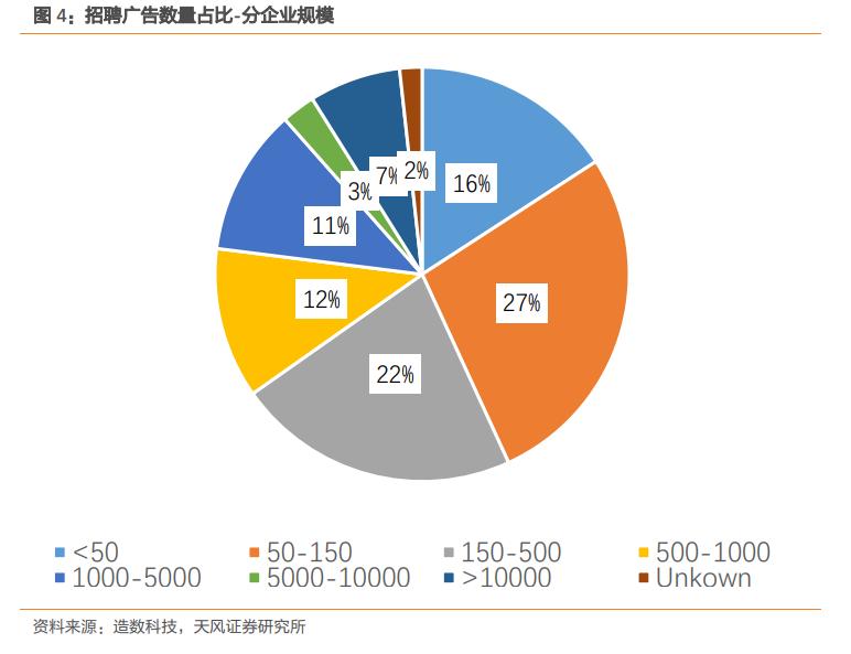 按企业规模划分,500 人以下的中小微企业占全部招聘广告的 65%,其中 150-500 人占比 22%,50-150 人占比 27%,50 人以下占 16%。500 人以上的企业招聘广告分布较分散, 500-1000 人占 12%,1000-5000 人占 11%,5000 人以上占 10%。所以,从关心就业的角度, 我们更应该关注的是 500 人以下,特别是 50-500 人的中小企业的经营情况,这类企业的招聘数量占了一半。