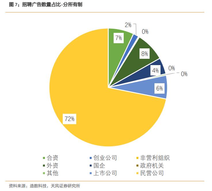按企业所有制划分,民企在全部招聘广告中占比 72%,国企占 4%,外资占 8%,合资占 7%, 整体上非公企业(除去国企和政府机关)招聘广告占比超过了 90%,可见民营经济在就业 和企业数量上的占比贡献巨大。