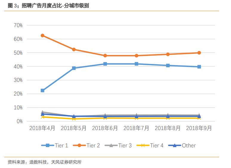 在消失的202万个招聘广告中,1线城市占15%,2线城市占68%,3/4/5线城市各占8%/3%/6%。 横向看,2 线的占比下降最快,1 线占比提升,3/4/5 线变化不大。所以,排除季节性因素 之外,我们更应该关注 2 线城市的就业问题。