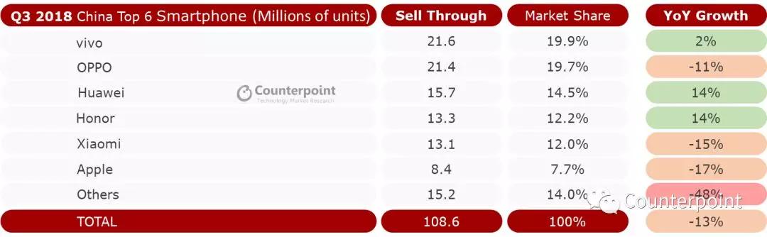Counterpoint数据显示,2018年第三季度,小米在中国市场销量为1310万台,同比下降15%,在六大品牌(vivo、OPPO、华为、荣耀、小米、苹果)中降幅仅次于苹果。小米的市场份额和OPPO、苹果、其他厂商一样,正在被华为、荣耀掠夺。