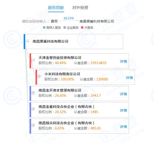 其中,小米、红米、POCO是小米自己推出的手机品牌,美图在被小米“迎娶”之前已有一定规模的用户群和知名度,黑鲨则是小米通过投资“绑定”。企查查数据显示,小米科技全资控股的天津金星创业投资有限公司是黑鲨科技最大股东,间接持有黑鲨科技36.13%股权的雷军是黑鲨疑似实际控制人。