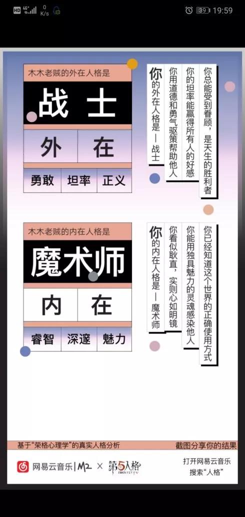 再看网易的这些一套套测试结果图片,他们会精心写了一组组文案,尽量让不同的人得到不同的结果,保持有趣而不失个性化。另外,这些描述都很正面,放谁身上都会窃喜,还有小小的得意感。