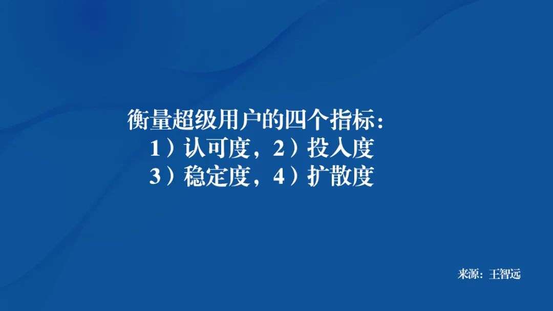 愿意给商品反馈建议,配合完成调研问卷,积极分享各种活动等;因此我们需要用四个维度来衡量超级用户:1)认可度,2)投入度,3)稳定度,4)扩散度