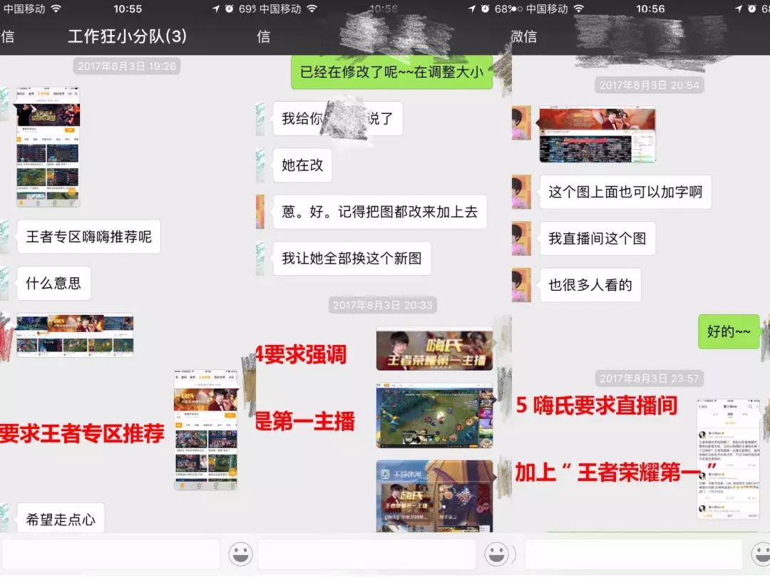该人士称,在直播上,要求强行增加直播人气、将所有推荐图加上“王者荣耀第一主播”字样、将所有顶级推荐资源给嗨氏。在媒体上,要强调“嗨氏始终是王者荣耀一哥”、“董小飒主动夸奖嗨氏”。除了微信聊天,还有不断的电话施压。