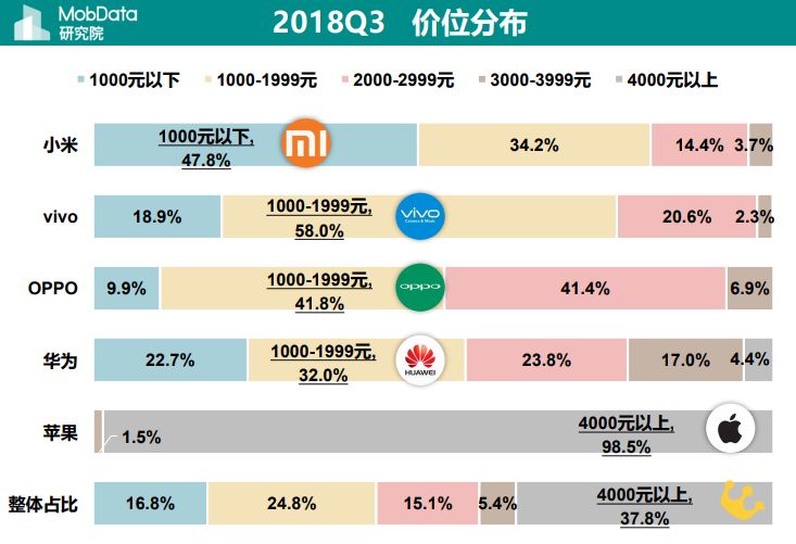 而统计数据显示,除了苹果手机,使用其他品牌手机的用户更倾向于 4000 元以下的机型,毕竟有房贷和车贷或其他生活压力时,购买手机会更追求性价比一些。