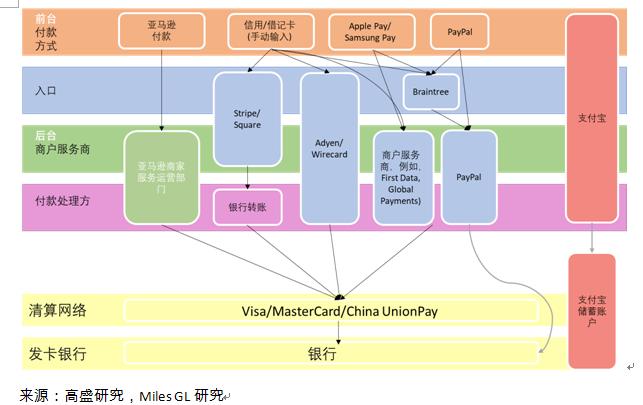 比如支付宝,就已经纵向从商户的支付入口、商户服务商、卡网络、发卡银行直到用户的电子钱包全部打通。在美国,最相似的就是PayPal/Braintree的组合,虽然不能绕过发卡银行,但是还是打通了大部分的层级。