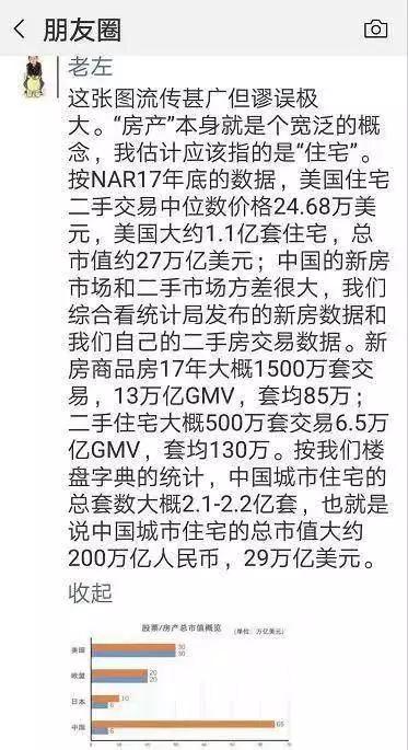 然后,链家网董事长左晖看不惯了,站出来辟谣,说中国根本没有这么大的泡沫,计算方法是错误的,中国房地产没有65万亿美元的,而是29万亿元!和美国差不太多。
