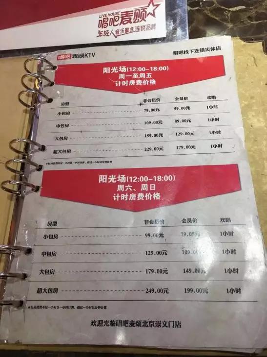 如唱吧麦颂北京崇文门店,这家店坐落于二环内的搜秀城国瑞购物中心四楼,店内空间大约在500-600平米之间,有22个包间左右。在工作日期间的阳光场(12:00-18:00),包厢的非会员单价在79-229元不等;遇到周六日,整体单价会比工作日贵上20块。昨天下午四点,当娱乐产业(ID:yulechanye)想进入店内进行消费时,却被前台告知除了个别的超大包房,已经没有了其他空闲包厢。从现场情景来看,这家店在空间利用率上显然达到了较高水准。