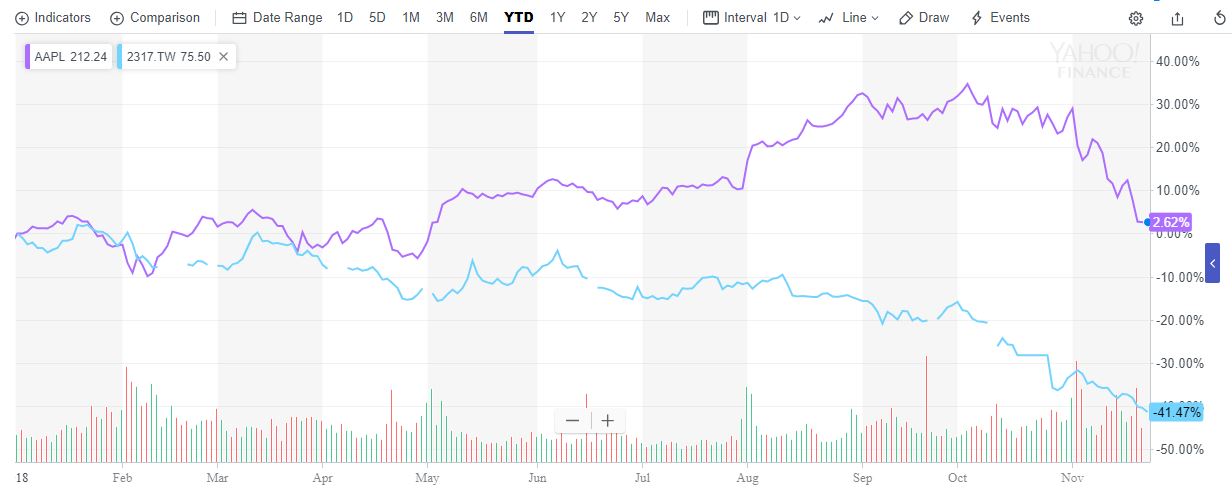 紫色为苹果、蓝色为鸿海台股,来源:雅虎财经