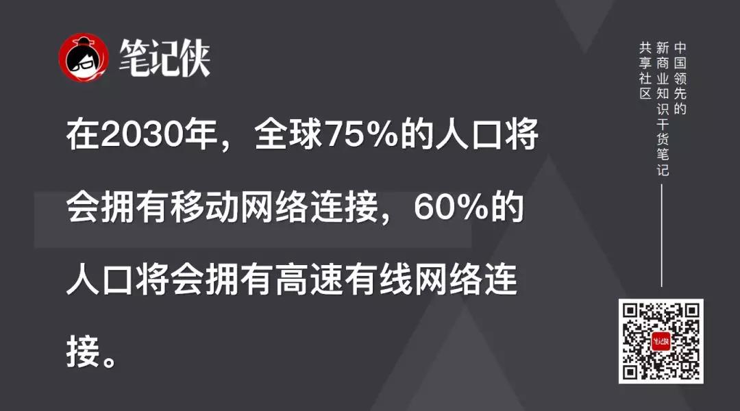 随着手机的威力越来越大,功能也越来越全面,移动网络的铺展也将加速。在2030年,全球75%的人口将会拥有移动网络连接,60%的人口将会拥有高速有线网络连接。