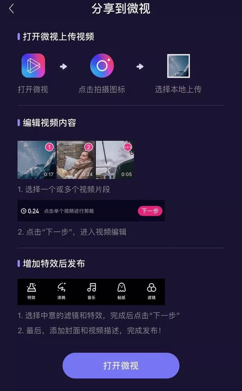 W2 智能眼镜并不能与微视 app 直接连接,也不能直接向微视分享视频。在「微视 X TONOT」app 内点击分享的按钮,选择微视的 logo 时,看到的是教你打开微视 app,再从本地相册上传视频的教程。
