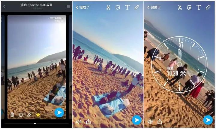 Spectacles 眼镜的摄像头扫一下 Snapchat 的个人二维码页面,就可以完成配对。用眼镜拍摄的短视频,在一定的网络环境下,可以直接同步到 Snapchat 账户,并且能在 app 中对视频进行编辑处理。