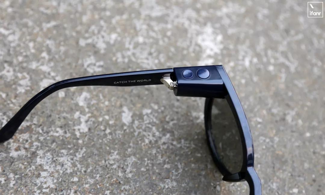 控制眼镜的按钮在左边镜架的上方,分别为电源键和拍摄键。长按或者短按拍摄键后,会发出相应的提示音,表示眼镜开始拍摄。