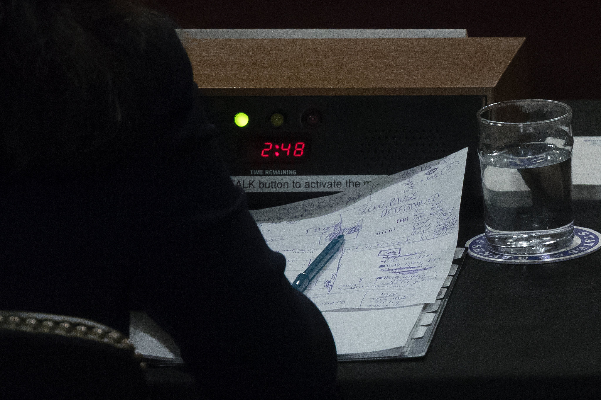 桑德伯格在她面前的桌子上摊开整洁的手写笔记:委员会里每位参议员的名字、他们喜欢的问题和关注的问题、提醒说声谢谢。