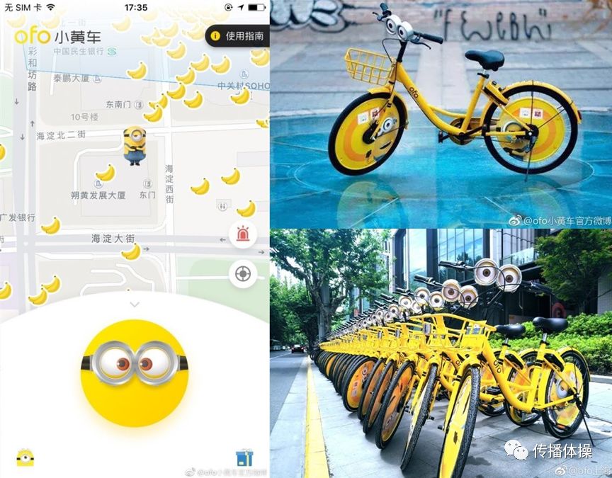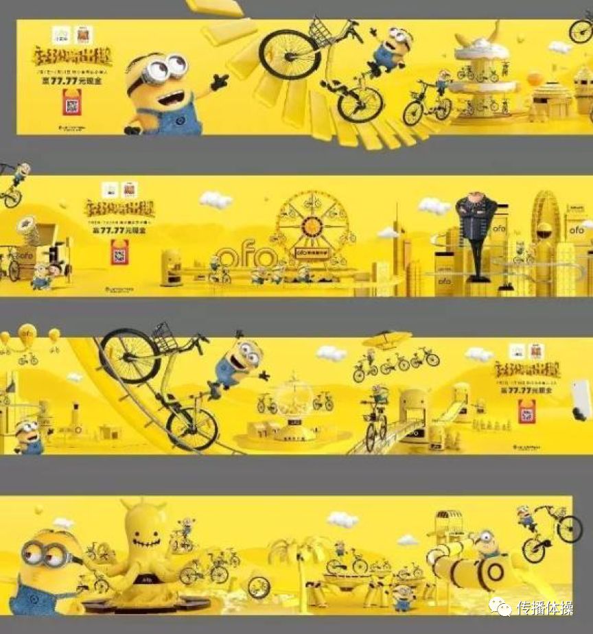 让人印象深刻的推广在2017年6月,《神偷奶爸3》6月30日在国内上映,ofo借此机会获得了环球影业旗下IP小黄人的授权,玩了一把漂亮的跨界合作。