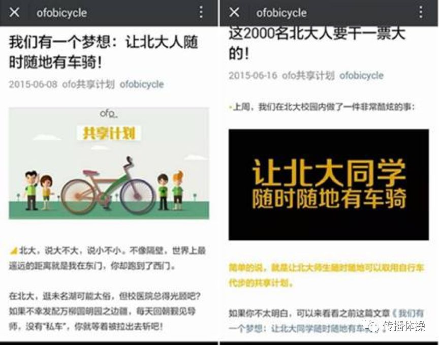 就像facebook起源于哈佛校园,ofo也是从北大人的刷屏开始。2015年夏天,ofo团队写了两篇影响力较大的爆款文,一篇《我们有一个梦想:让北大人随时随地有车骑》圈粉3万,另一篇《这两千名北大人要干一票大的》阅读4万,刷爆北大人的朋友圈。