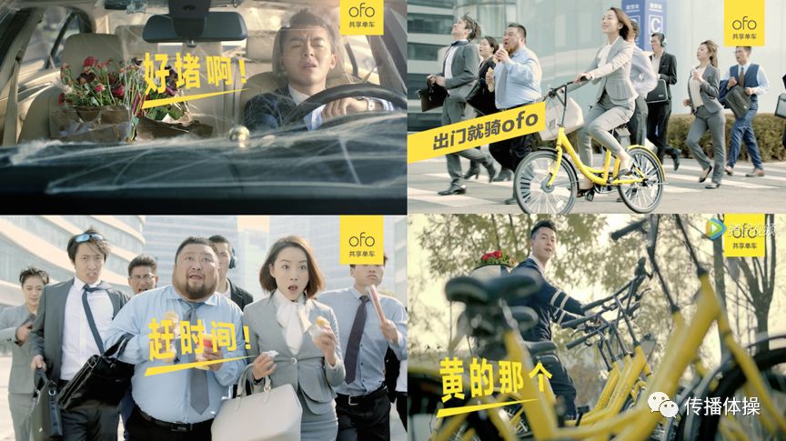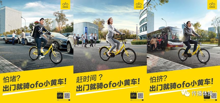 线上方面,ofo发布了三则广告片和KV,虽然内容看上去搞笑得有点尴尬,但确立了ofo的三个主要使用场景:怕堵、赶时间、怕挤。