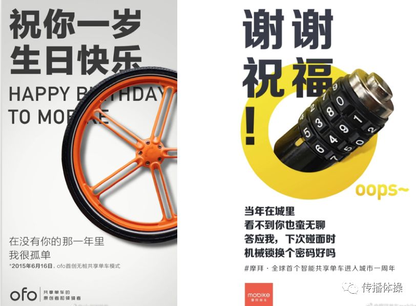 值得一提的是,4月份ofo和摩拜还经历过一次公关口水仗,在4月22日摩拜周年庆时,ofo不怀好意地发出一张海报帮摩拜庆生,由此拉开了两家的公关战。