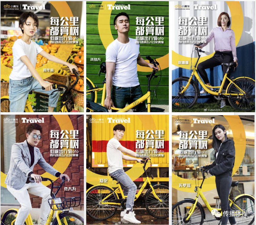 同在4月,ofo与NYT旅行推出了一个低碳骑行的常规活动,但这次活动中拉来了不少明星,如蒋劲夫、袁姗姗、邓伦、周冬雨等,开启了ofo明星合作的时代。