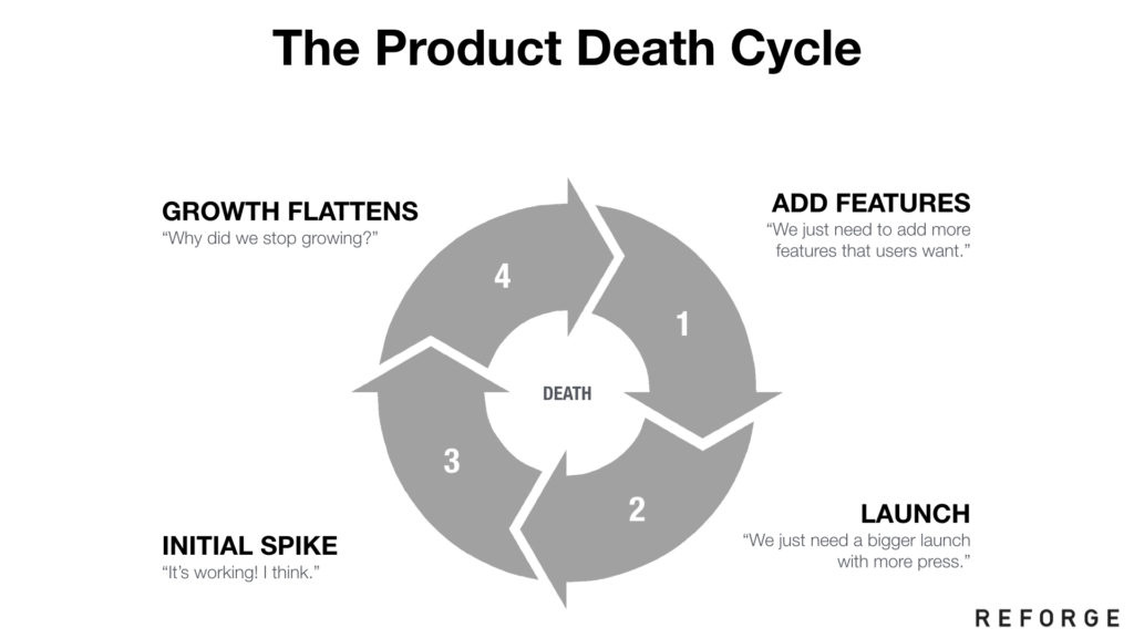 不幸的是,这往往就是我们的产品交付和发布方式。有人有愿景,有人开发了一些功能并且进行了发布。一开始产品可能有点冲劲,但是当增长放缓时,却不知道该作何着手。他们跟一些客户交谈,问对方想要什么,然后再次尝试。他们又增加了一些功能,重新发布,于是这个周期周而复始。