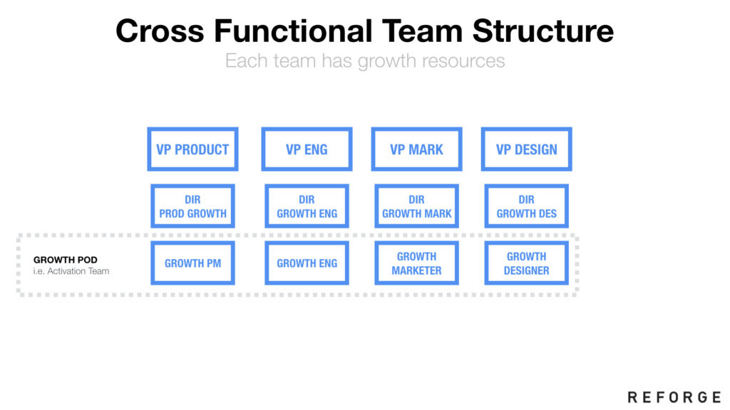上图:一个常见的结构是把增长团队当作一组pod,每一个都对应各自职能。比如增长经理向产品等汇报,所有的人组成增长团队。很多产品团队都是这个样子,所以相对比较适合。