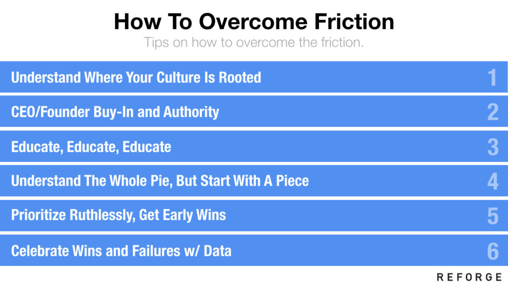 上图:这些是克服不可避免的组织摩擦的一些策略。其中包括1)理解文化根源2)CEO/创始人认同并授权3)教育,教育,不断地教育4)着眼全局,小处做起5)分出轻重缓急,积小胜为大胜6)用数据总结得失