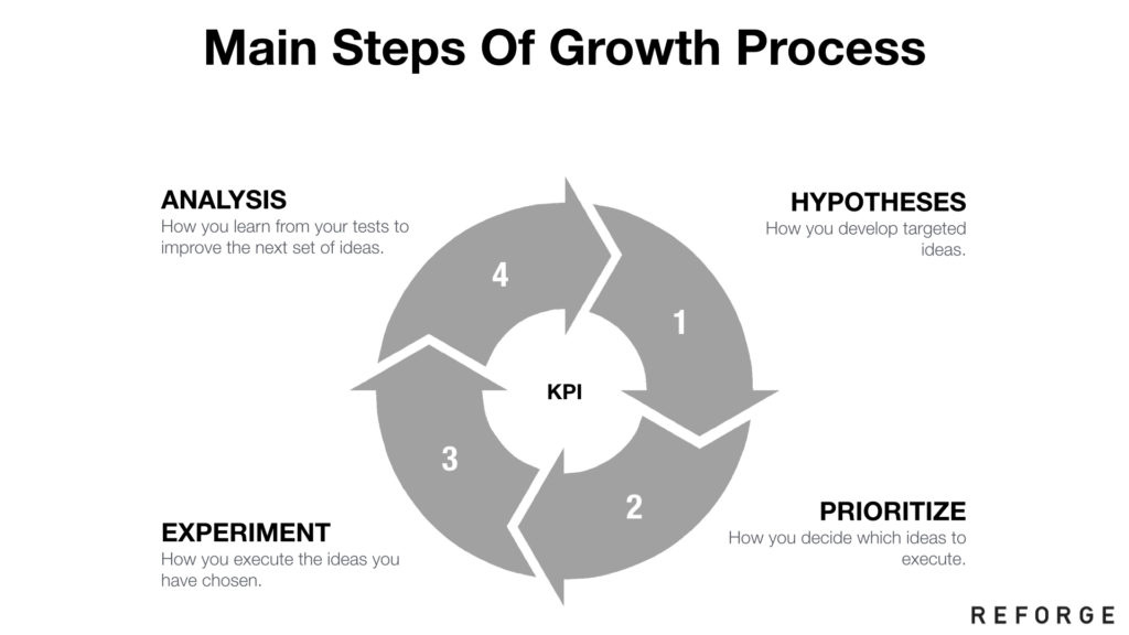 上图:就像你对科学方法的预期一样,增长流程的主要步骤包括理解数据、建立识别特定流程之所以会出现的假设,对那些想法进行优先排序,进行试验,然后重复这个循环。
