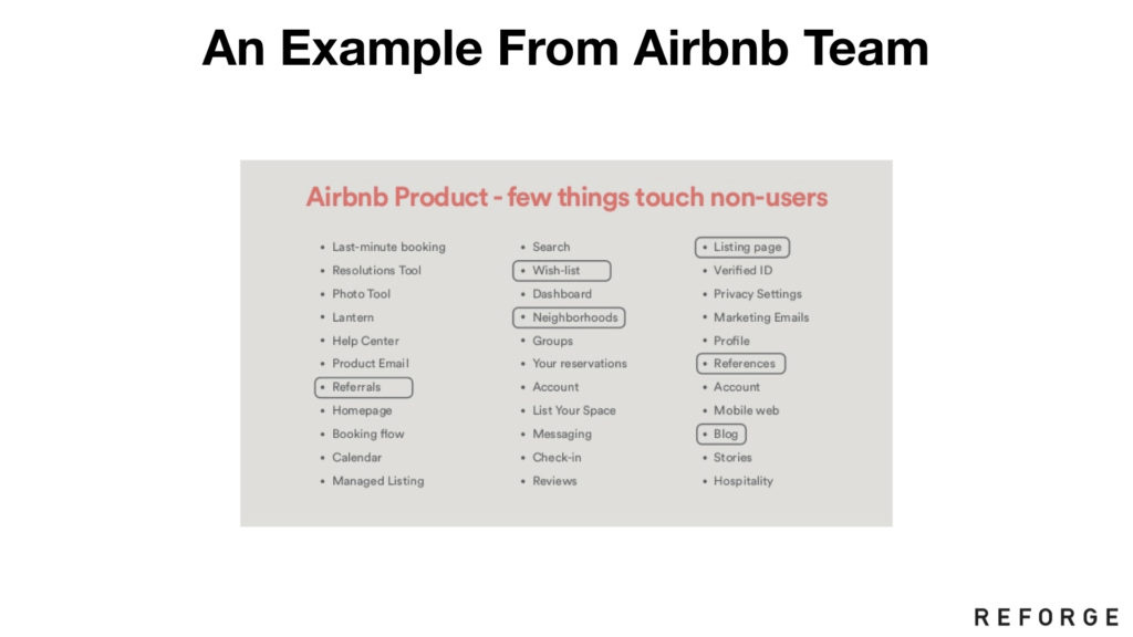 上图是Airbnb的增长团队的分享,他们做的就是这种练习——在所有33个环节里面只有6个是针对非用户的。增长团队可以迅速扩展这个列表,给处在边缘的受众一些爱。