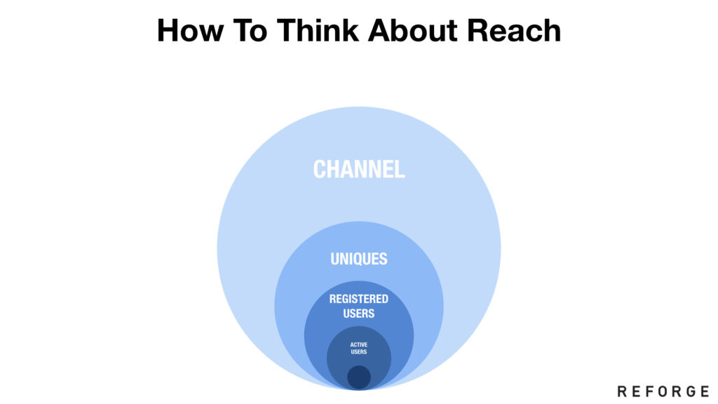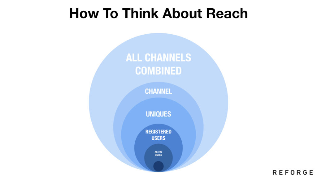 上图:说了这么多其实是想说如果你要找提升增长空间的最大手段的话,这个东西可能就在于到达(Reach)。当你发现你的增长团队的项目跟核心产品团队发生冲突时,不妨考虑上述同心圆——一步步地切入到更大的用户范围,无论是面向新用户、流失用户,以及所有尚未认同你产品的边缘人等。