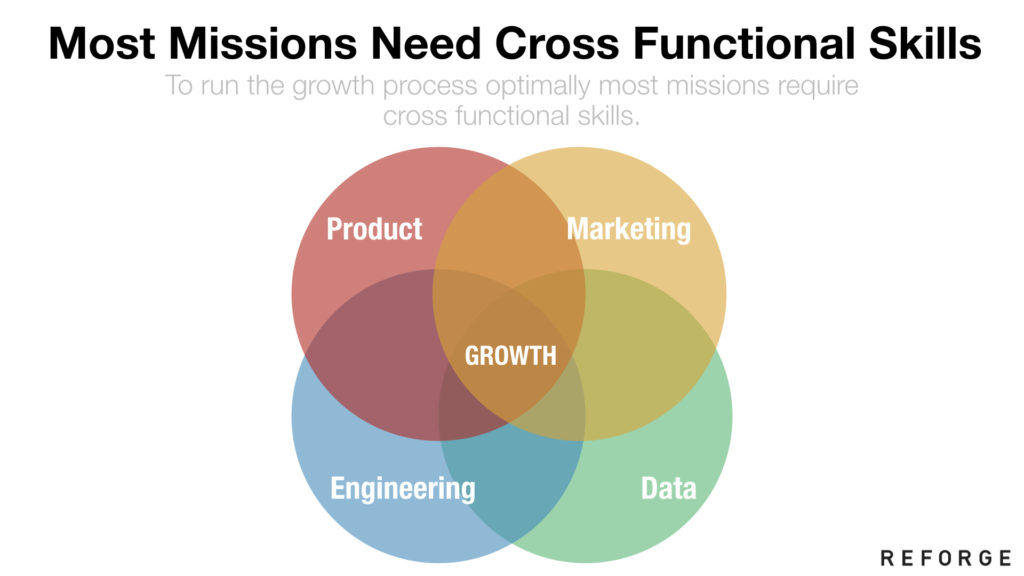 最终的目标是要根据你的洞察和假设定义问题,并且配置好团队成员来解决特定问题。不同的团队也许强调不同的技能,视其他团队的使命不同,增长团队所适应的宏观组织结构也许也许有一些复杂性。