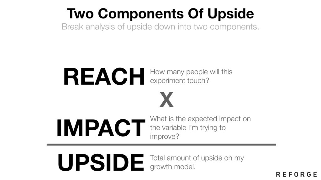 这两个因素里面,影响的随机性往往最强。有时候一个改变可以推动改进+5%,有时候可以改进+50%。基本上绝大部分项目的结果都在这两个数之间。对于某些项目来说,如果产品体验可以发生多次的话,影响会非常巨大——比方说,一个新的高度相关的统治在产品的核心互动循环里面发出。或者某个显著放大病毒式循环的东西,导致飞轮转得越来越快。(但这已经超出常规了——不过这也告诉你有这种途径去创造巨大影响)