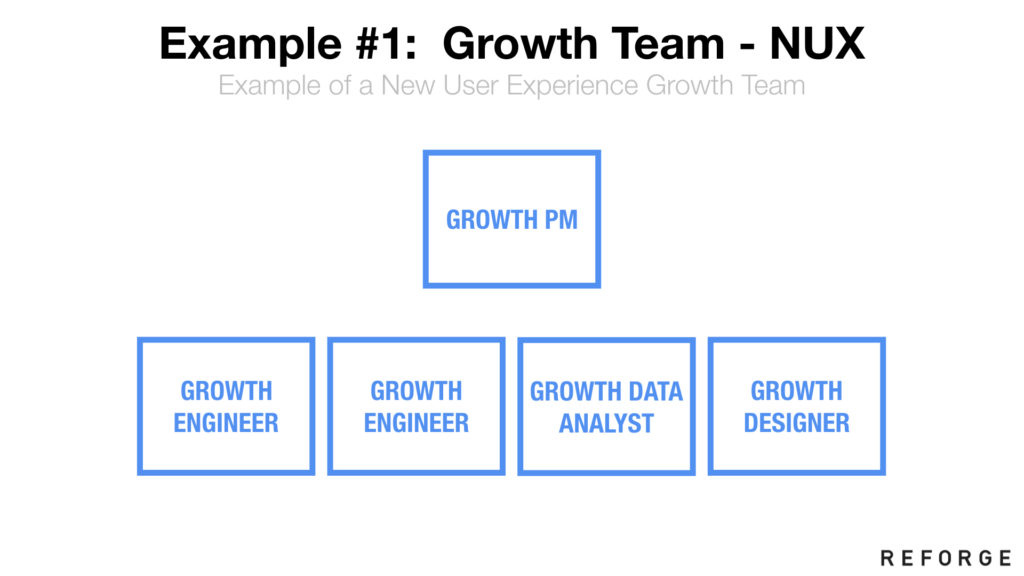 上图:视你要解决的问题而异,增长团队的构成可能会略有不同。对于新用户体验来说——这可能包括了增加注册转化,甚至可能还包括集成进广告里面——你也许会特别强调工程师。你可能想要Android和iOS工程师。此外甚至还包括营销绩效的人,一些数据分析师去看看指标等。