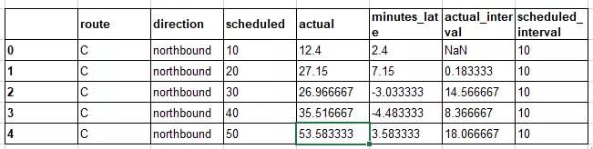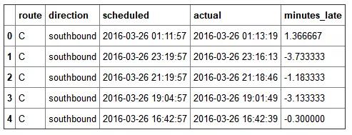 df = df[['route','direction','scheduled','actual','minutes_late']].copy()