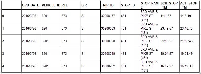 该数据集包含2016年第二季度记录的西雅图市中心3rd & Pike公交站的西雅图Rapid RideC、D、E线的预定和实际到达时间。